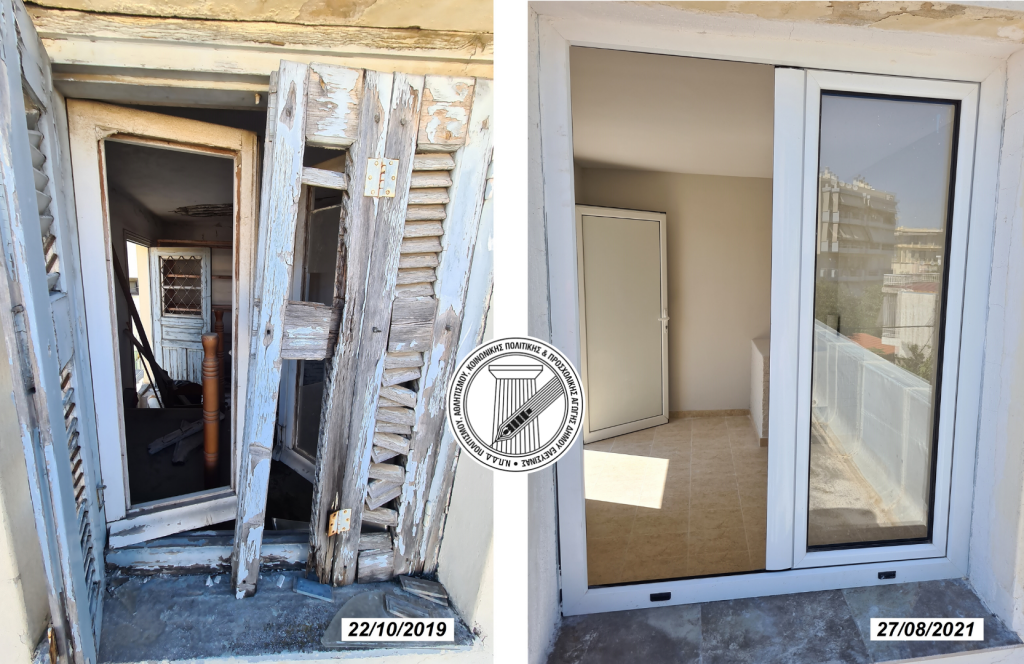 Επισκευή τοιχοποιίας, τοποθέτηση πλακιδίων, αντικατάσταση πόρτας και παραθύρου και ελαιοχρωματισμός της αποθήκης στο δώμα του κτηρίου